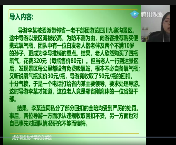 从教学形式上,针对《导游实务》知识要求高、操作性强的特点,克服网络教学小组互动不足的弊端,邓老师积极探索“直播+云课堂+录播+QQ群”。据学生反馈,这种授课方式就像是真正在教室听课。