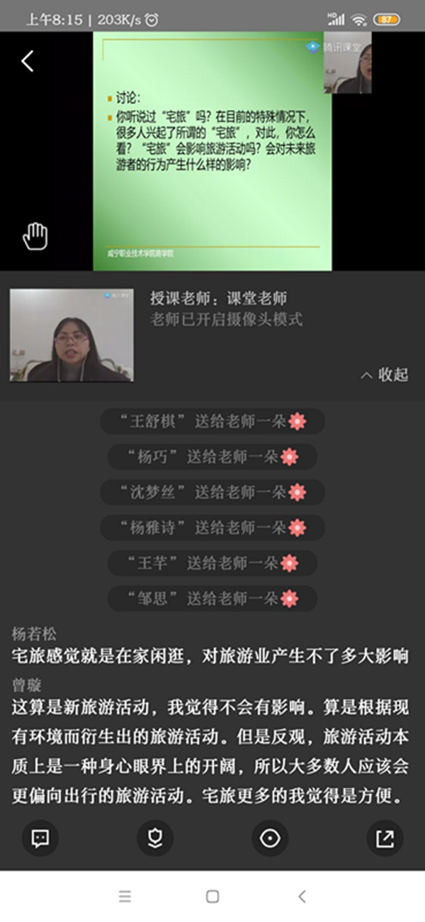 教学过程上,在上课伊始,邓教授开展“头脑风暴”,积极与学生互动,比如你听说过“宅旅”吗?在目前的特殊情况下,很多人兴起了所谓的“宅旅”,对此,你怎么看?“宅旅”会影响旅游活动吗?会对未来旅游者的行为产生什么样的影响?激发学生的学习兴趣,引发学生关注疫情期间旅游业的发展新动向,例如无接触式旅游,景区现在逐步恢复营业是否可取?该如何保障游客安全等。