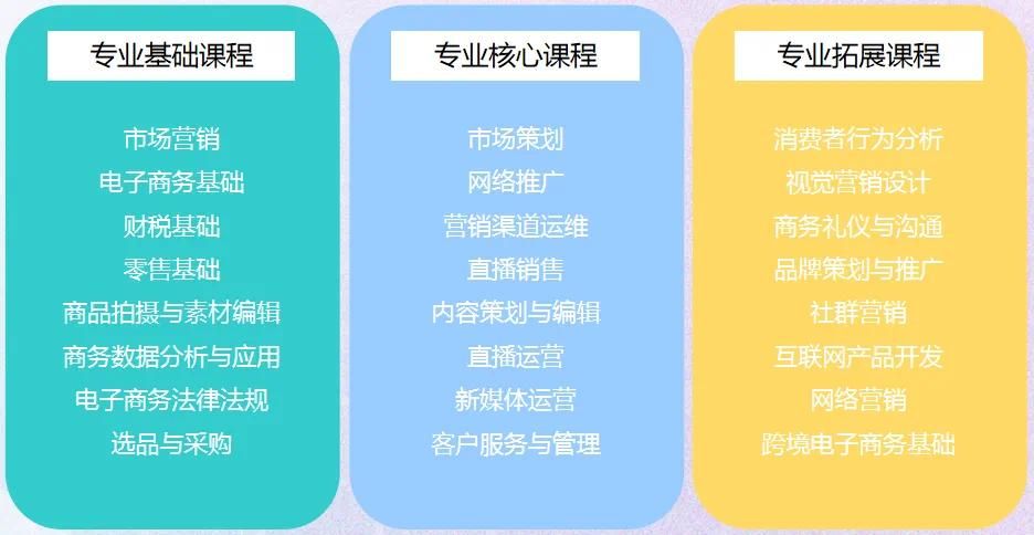 本专业主要课程包括:市场营销基础、电子商务基础、直播销售、直播运营、市场策划、网络推广、营销渠道运维、内容策划与编辑、新媒体运营、客户服务与管理、商品拍摄与素材编辑、商务数据分析与应用、电子商务法律法规、选品与采购等理实一体化课程及实践拓展训练等。